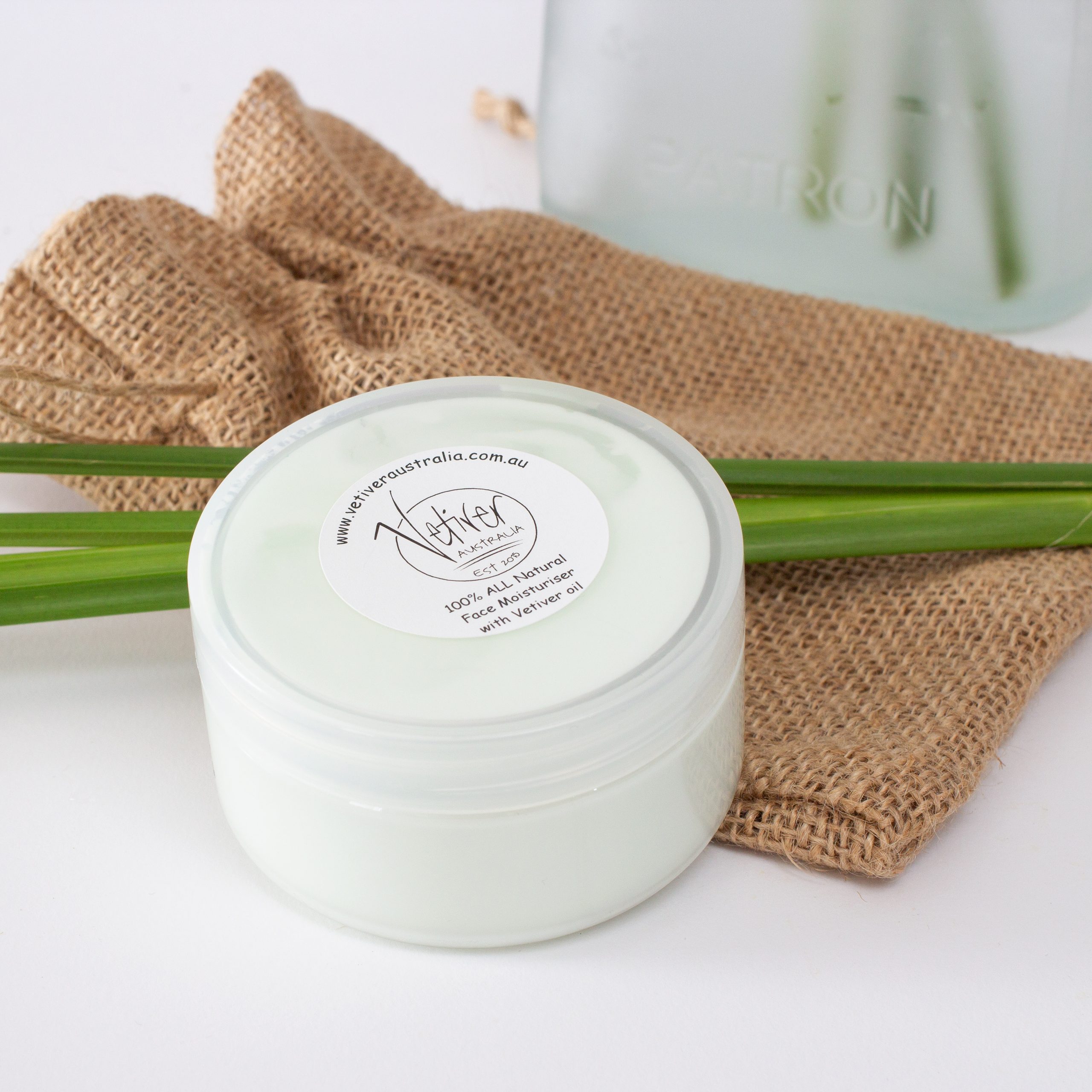 Our face moisturiser is made from 100% All Natural Australian steam distilled Vetiver water, Vetiver, Avocado, Macadamia, Pomegranate, Rosehip, Frankincense and Lavender oils. Package 100g
